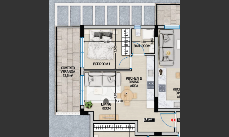 1 Bed / 1 Bath / 45 m² Covered Area / 13 m² Covered Verandas / Newly Built / Title Deed: Available.